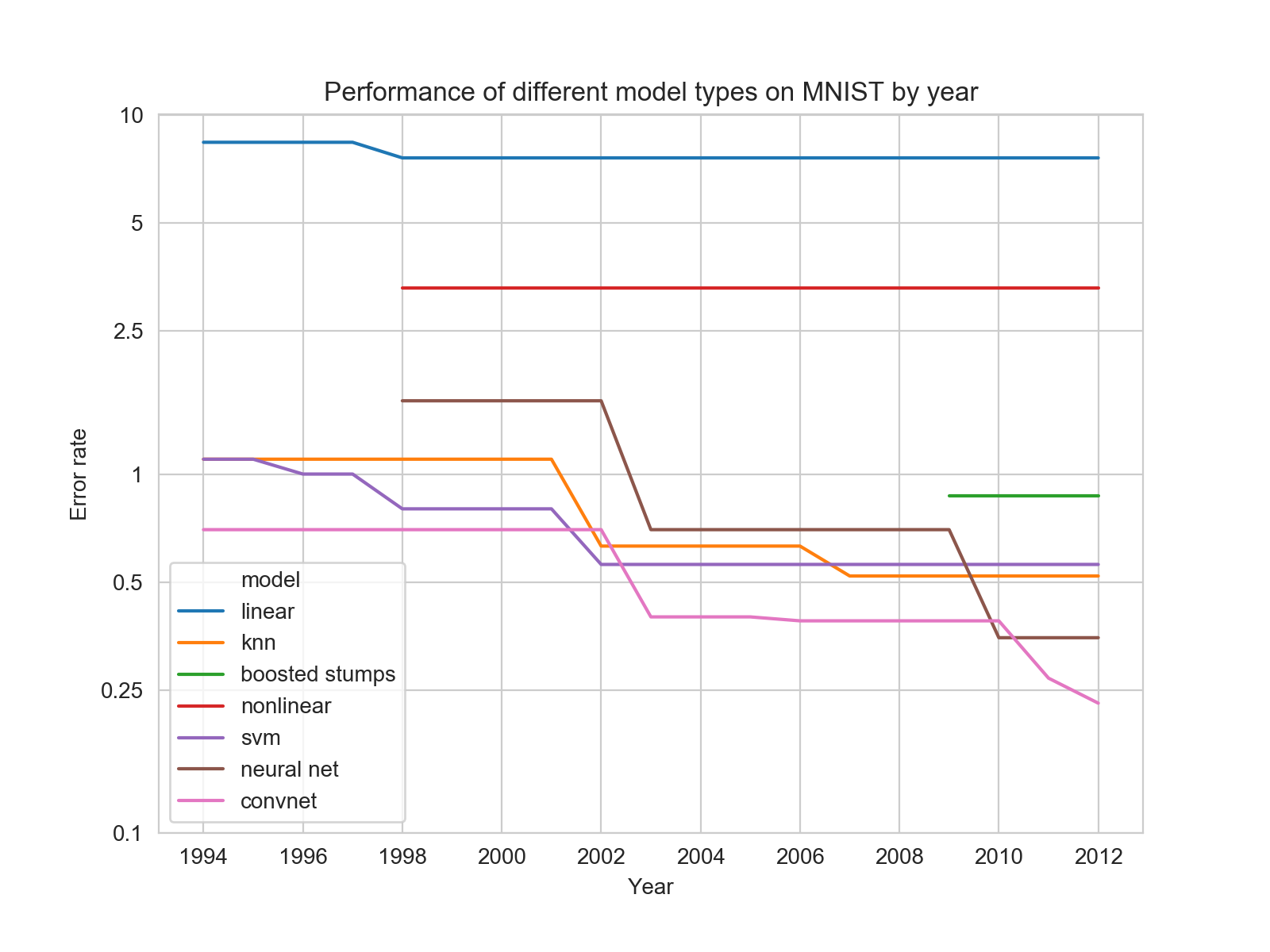 To investigate this, I went to a table of top performances on the MNIST dataset maintained by Yann LeCun. This table is helpfully organized by model type and year.